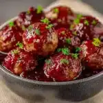 In a separate bowl, mix one cup of cranberry sauce with a tablespoon of soy sauce, a tablespoon of honey for sweetness, and one teaspoon of Worcestershire sauce, creating a luscious glaze. Pour this shiny sauce over the meatballs, ensuring every morsel is kissed with flavor. As you bake these divine creations in the oven for twenty-five to thirty minutes, the scent of cranberries and spices will envelop your kitchen, making your heart swell with anticipation.