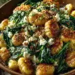 Creamy Gnocchi with Spinach and Feta pairs wonderfully with a fresh green salad or crispy garlic bread, both complementing the dish’s rich flavors without overwhelming them.