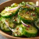 For a zesty twist, try adding lime juice and crushed red pepper flakes, offering an exhilarating heat that awakens the senses to the chilled cucumbers.