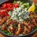 A Greek Chicken Bowl is a delicious assembly of marinated chicken, fresh vegetables, feta cheese, and creamy tzatziki sauce, served in a bowl for easy enjoyment.