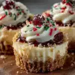 No-Bake Christmas Mini Cheesecakes are small, creamy desserts made without baking that feature a graham cracker crust filled with a rich mixture of cream cheese, whipped cream, and sugar.