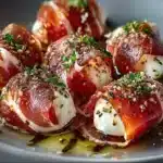 Prosciutto Wrapped Mozzarella Bites are savory appetizers made by wrapping creamy mozzarella balls in thin slices of prosciutto, baking them until crispy and golden. They offer a delightful contrast in texture and flavor.