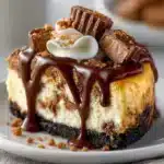 Before serving, garnish with chopped Reese’s Peanut Butter Cups, adding a beautiful touch to the luscious cheesecake. Enjoy every creamy bite!